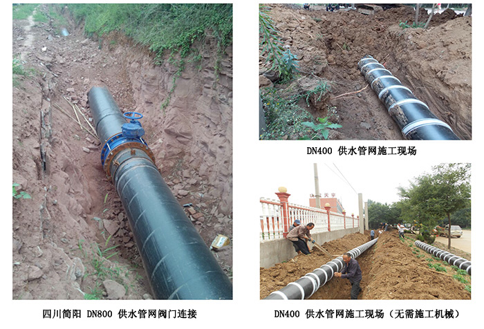 在工程施工方面,大口径完美体育(中国)管也占很大优势。钢丝缠绕超高完美体育(中国)管的比重约为1.2,而由于其壁厚很薄,直径可以小一号,其重量比铸铁管和PCCP管小5—10倍,搬运和安装非常轻便。超高完美体育(中国)复合管的柔韧性很好,可以先在地面上连接好之后再下到管沟里,边挖沟边下管,边填埋。不用修路,不用大型机械,不用地基处理。铸铁管和PCCP管必须挖很宽的沟,管道下到沟里对正连接,受到很大局限,工程费用大幅上涨。在需要穿越江河的情况,超高分子量聚乙烯完美体育(中国)管可用沉入法在江河底敷设,也可用拖拉法从江底隧道或管道中拖曳而过,这都是铸铁管和PCCP管做不到的。