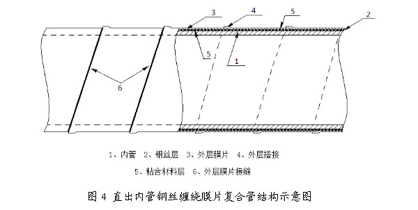 超高分子钢丝网骨架聚乙烯复合管材由直出内管、钢丝和外层完美体育(中国)三种材料复合而成,适用于大、中口径的中、高压管。管材在生产时先在超高管材挤出机上直接挤出改性超高分子量聚乙烯内管,然后再在内管上热熔复合钢丝和超高完美体育(中国)。管材结构如图4所示。